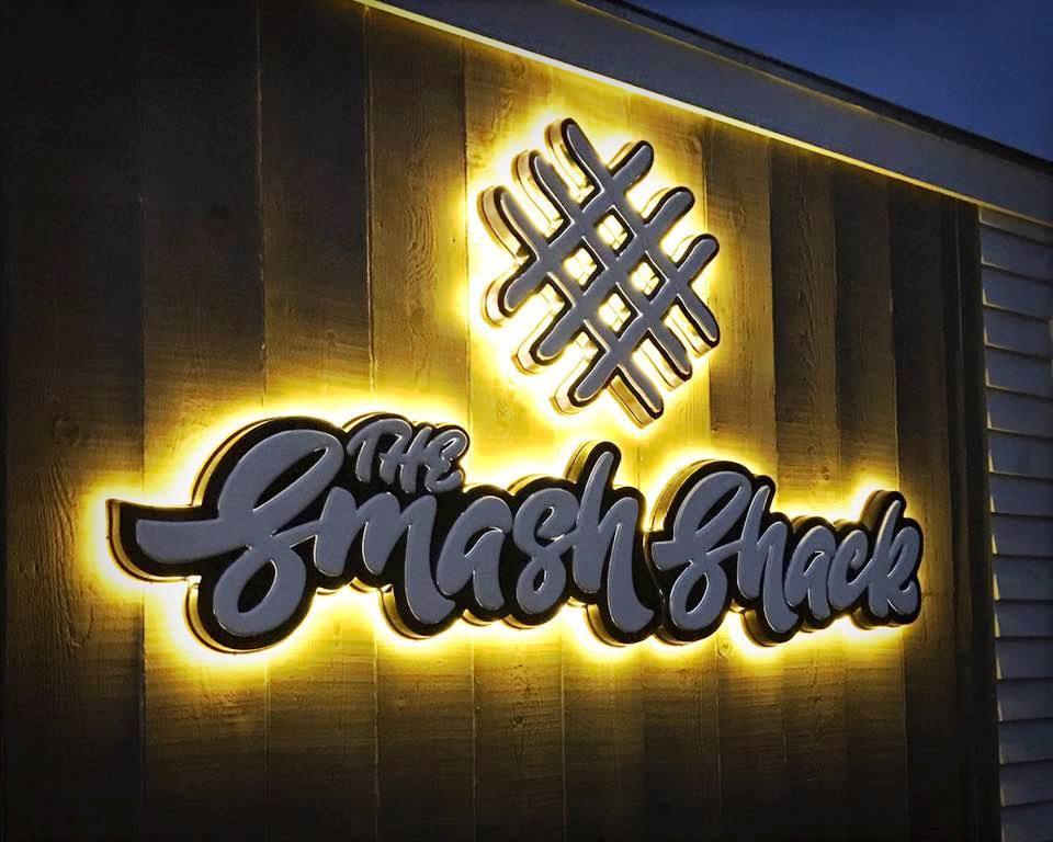 The Smash Shack food truck located in Greenville, NC catches the eyes of potential customers with a minimalistic approach. The white-wood paneling reflects their brand personality. Their dimensional logo is highlighted by backlighting, complemented by the vintage feel of the neon.
