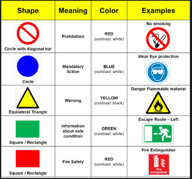 Red – Prohibition Signs (Danger or Emergency, Do not do this); Fire Signs (Fire Equipment)